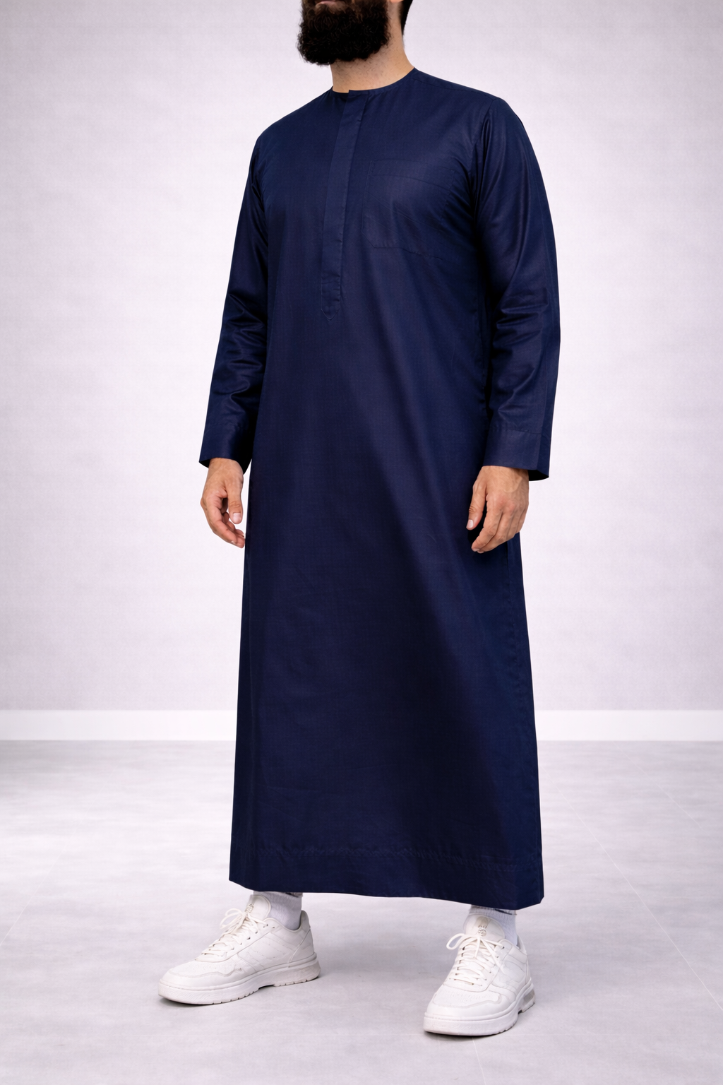 Prachtige qamis zonder kraag gemaakt van de stof ‘Platinum’. Met verstopte knoopjes op de borst voor een elegante look.